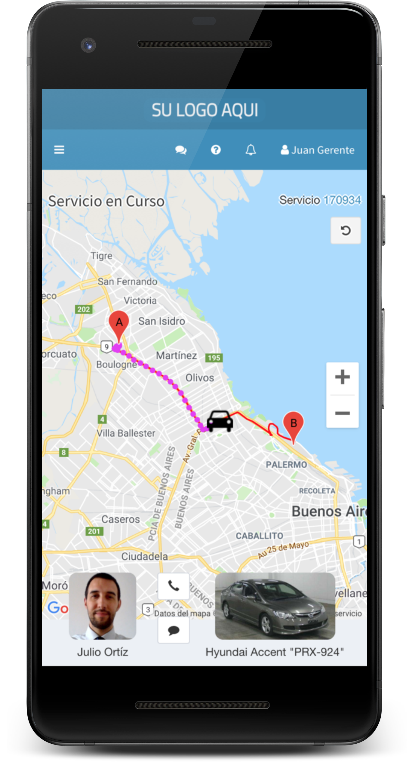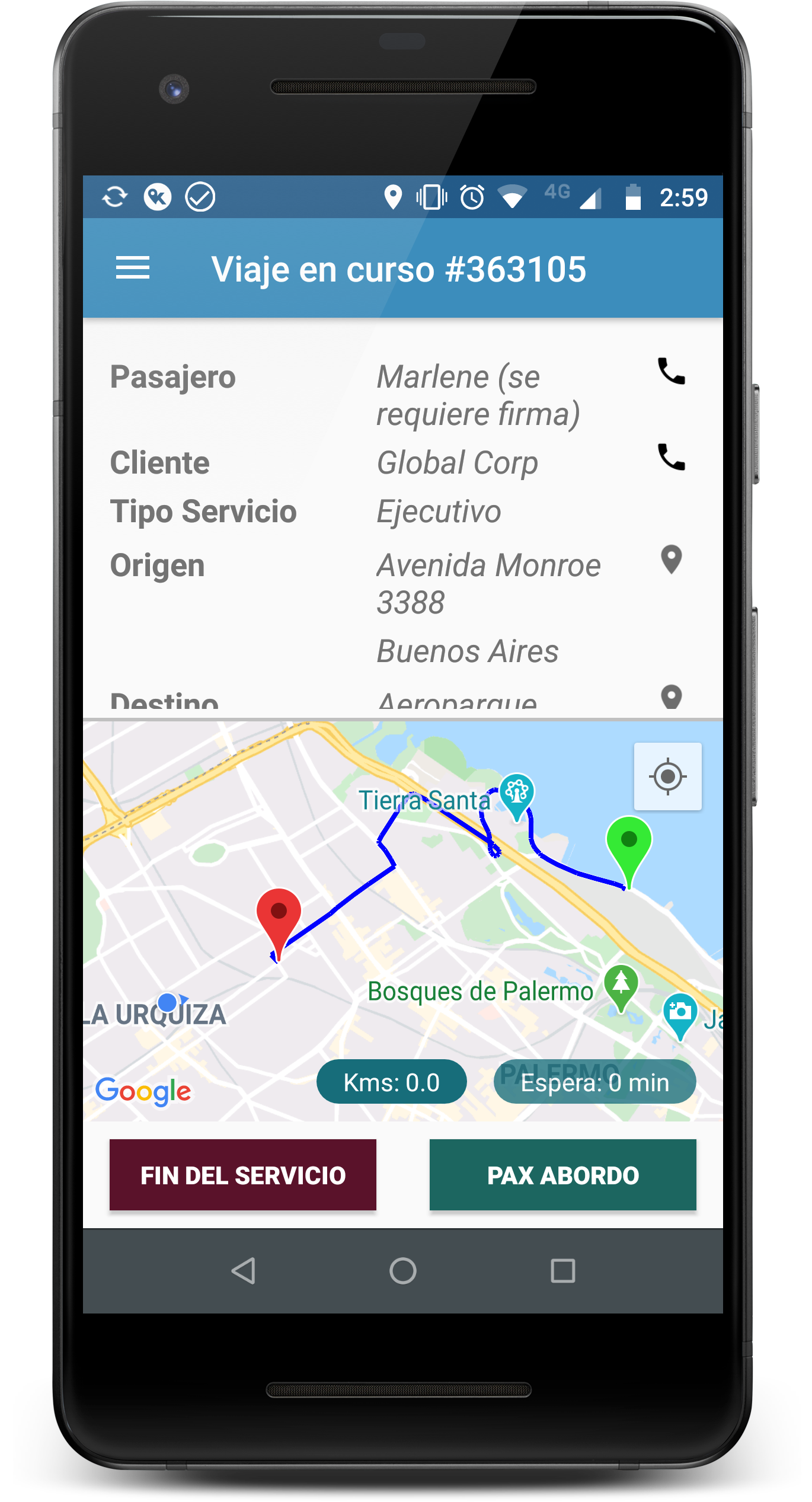 Le permite al chofer recibir una alerta instantánea con los datos del viaje, y enviar su ubicación GPS durante el mismo para ser consultada desde la aplicación web. Además permite al chofer gestionar sus datos, ver el historial de viajes, liquidaciones, etc.